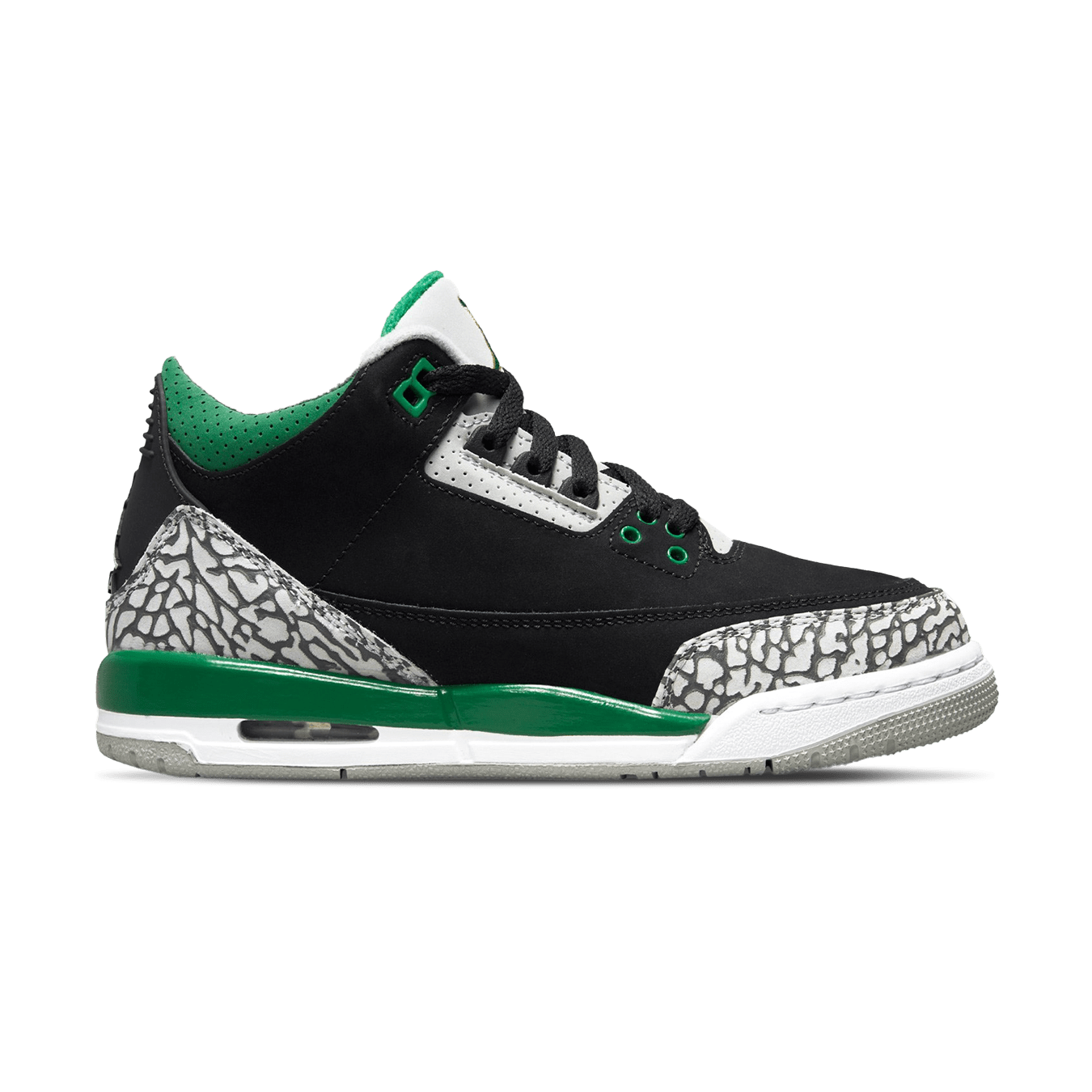 Offered in big kids sizing, the Air Jordan 3 Retro GS ‘Pine Green’ dresses the vintage 1988 silhouette in a black nubuck upper with signature elephant-print overlays at the forefoot and heel. Lush green accents settle on the eyelets, perforated leather collar, and embroidered Jumpman branding atop the tongue. A secondary Jumpman logo decorates the sneaker’s back heel. The mid-top is mounted on a two-tone polyurethane midsole, fitted with visible Air-sole cushioning in the heel and reinforced by a durable rubber outsole.