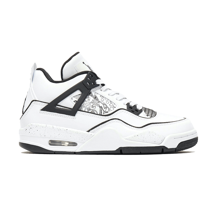 Air Jordan 4 Retro GS ‘DIY’ treats the vintage mid-top to a blank-slate design, highlighted by a white leather upper with a series of contrasting black accents. They include the sneaker’s collar lining, Jumpman branding hits, and TPU eyelets and wings. Black piping on the midfoot and forefoot overlay echoes the pen-and-ink graphics on the quarter panel, which can be filled in with colors via a set of multi-hued markers. Light speckling dusts the midsole, featuring visible Air-sole cushioning under the heel.